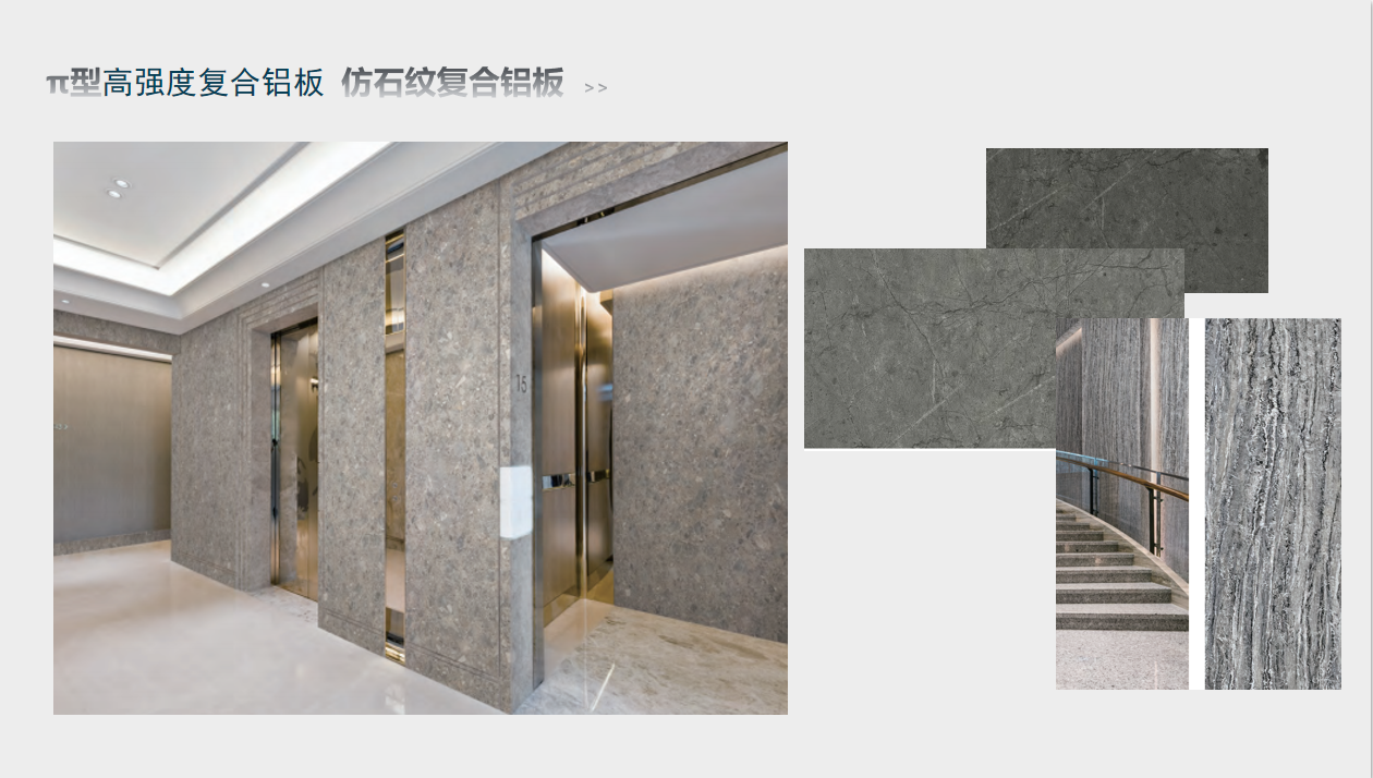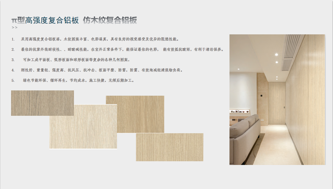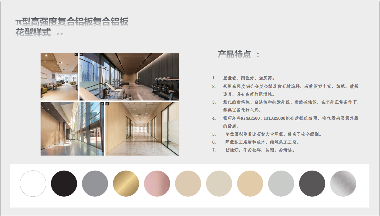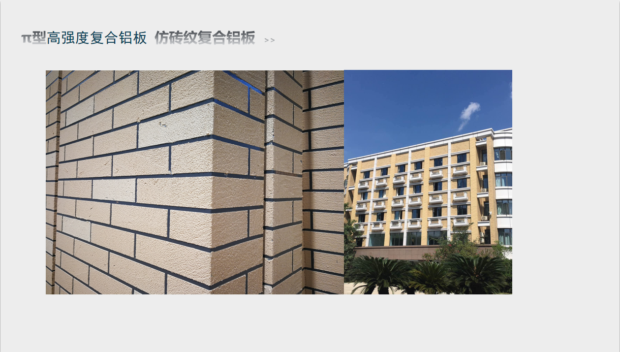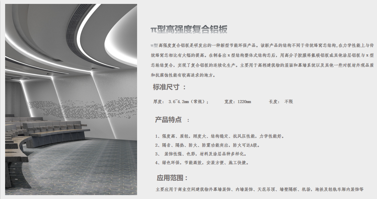 π型高強(qiáng)度復(fù)合鋁板是研發(fā)出的一種新型節(jié)能環(huán)保產(chǎn)品。該新產(chǎn)品的結(jié)構(gòu)不同于傳統(tǒng)蜂窩芯結(jié)構(gòu),在力學(xué)性能上與傳統(tǒng)蜂窩芯相比有大幅的提高。在制備出π型結(jié)構(gòu)整體式結(jié)構(gòu)芯后,用高分子膠膜將氟碳鋁板或其他涂層鋁板與π型芯粘結(jié)復(fù)合,實(shí)現(xiàn)了復(fù)合鋁板的連續(xù)化生產(chǎn)。主要用于高檔建筑物的屋面和幕墻系統(tǒng)以及其他一些對板材外觀品質(zhì)和抗腐蝕性能有較高追求的地方,如:商場、學(xué)校、醫(yī)院、地鐵站、高鐵站、機(jī)場、劇院、體育場館等大型公共場所。